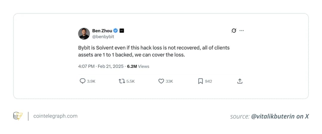 رئیس Bybit، بن ژو، در کمتر از ۳۰ دقیقه پس از یک سرقت بزرگ از ولت سرد اتریوم (۱.۴ میلیارد دلار)، در ایکس حضور یافت و کاربران را مطمئن کرد که سرمایهها امن است و صرافی نقدینگی کافی دارد.