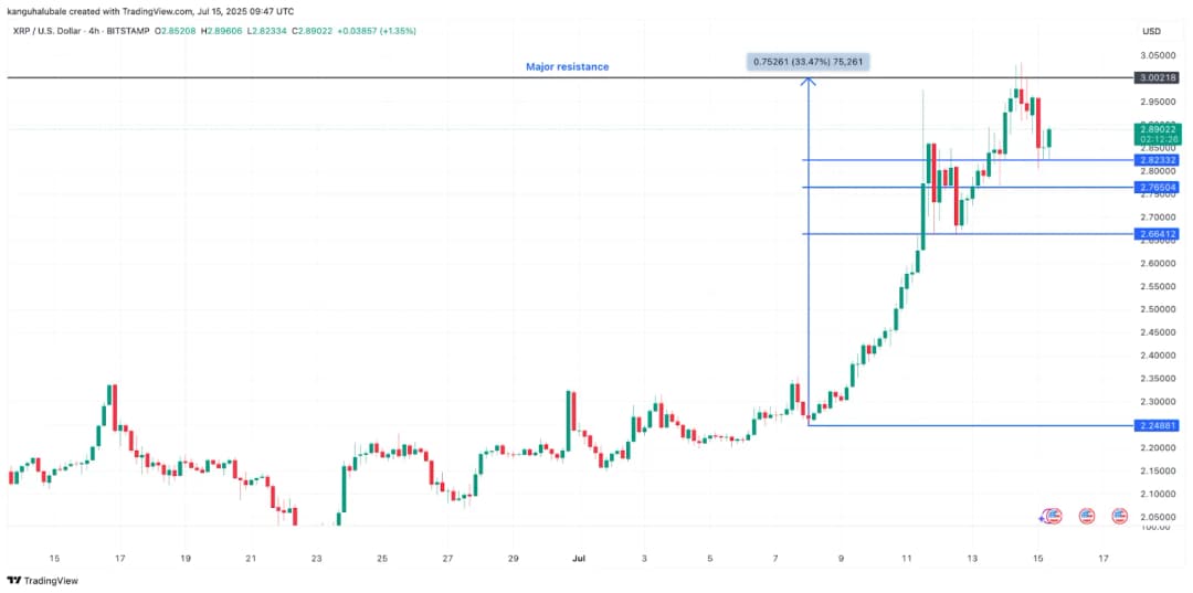تحلیلگران میگویند سطح مقاومتی ۳ دلار کلید مهمی است و تنها با عبور قیمت از آن مسیر برای ثبت رکوردهای جدید هموار خواهد شد. رشد ۳۳ درصدی XRP که از ۸ تا ۱۸ ژوئیه رقم خورد، در همین سطح ۳ دلار متوقف شد. اکنون خریداران باید این مقاومت مهم را بشکنند تا از اصلاح عمیقتر قیمت جلوگیری کنند.
