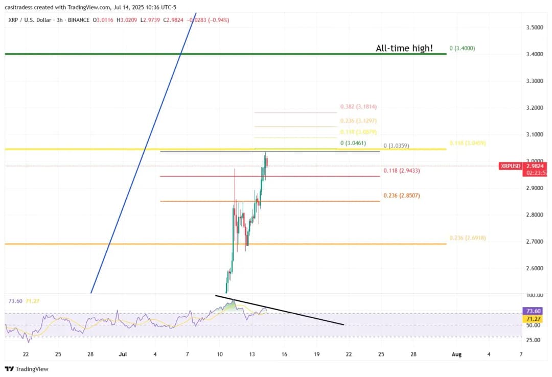 بر اساس گفته کریپتو آنالیست CasiTrades، اگر XRP بتواند سطح ۳ دلار را بشکند، مقصد بعدی میتواند ثبت رکورد قیمتی جدید باشد. به گفته او، این سطح با اصلاح فیبوناچی ۰.۱۱۸ از قیمت ۳.۴۰ دلار همراستا است و «بازپسگیری این سطح، یک نشانه قوی دیگر برای زنده بودن و شتاب گرفتن موج سوم XRP خواهد بود.»