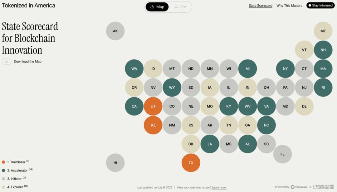 طبق گزارش جدیدی از چینلینک و انجمن بلاکچین، ایالتهای آریزونا، تگزاس و یوتا به عنوان رهبران سیاستهای رمزارزی در ایالات متحده شناخته شدهاند. همزمان، توجه سرمایهگذاران به «هفته رمزارز» در آمریکا جلب شده که ممکن است سه قانون مهم در آن به تصویب برسد.