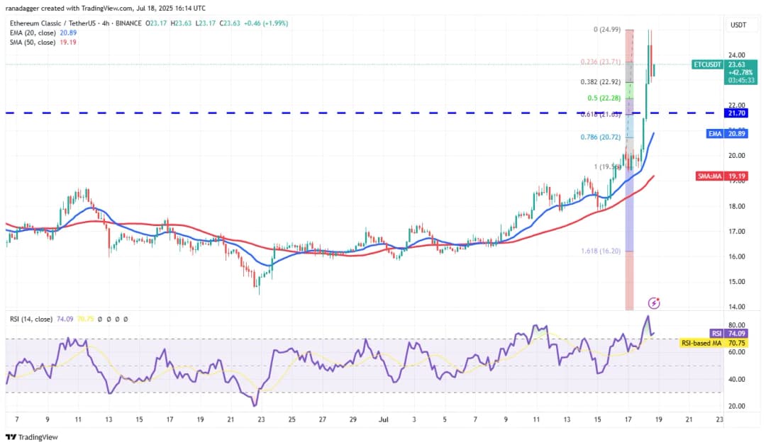 اتریوم کلاسیک (ETC) جمعه بالای مقاومت ۲۱.۷۰ دلار جهش کرد که نشان از بازگشت قوی خریداران دارد. این رشد سریع RSI را به منطقه اشباع خرید برده و امکان اصلاح کوتاهمدت یا نوسان قیمت را افزایش داده است. اگر قیمت از حمایت ۲۱.۷۰ دلار با قدرت بازگردد، احتمال رشد تا ۲۷ دلار است، اما کاهش به زیر این سطح نشاندهنده رد شکست است و قیمت میتواند تا EMA ۲۰ روزه (۱۸.۵۰ دلار) بریزد.