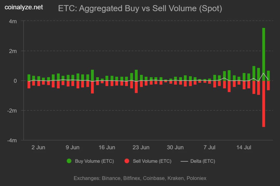 اما چرا اتریوم کلاسیک در شرایطی که کل بازار ارز دیجیتال در حال اصلاح است، مقاومت نشان میدهد؟ در حالی که خریداران سراسر بازار ارز دیجیتال عقبنشینی کردهاند، تقاضا برای اتریوم کلاسیک افزایش یافته است. طبق دادههای Coinalyze، حجم خرید اسپات ETC در ۱۸ ژوئیه به ۳.۵۷ میلیون رسید، در حالی که حجم فروش ۳.۰۸ میلیون بود. همین روند در ۱۹ ژوئیه تکرار شد و حجم خرید ۶۸۵ هزار و حجم فروش ۶۲۳ هزار ثبت شد.
