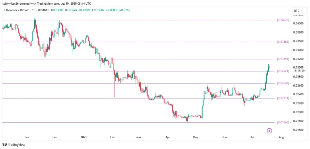 اگرچه شاخصها عموماً از آغاز فروش گسترده در بازار آلتکوینها خبر میدهند، دادههای شاخص ETH/BTC نشانههایی از یک رالی احتمالی را نشان میدهد. معمولا وقتی این شاخص به سمت بالا حرکت میکند، نشانه ورود سرمایه از بیت کوین به سمت اتر و دیگر آلتکوینهاست. اگر این روند صعودی ادامه یابد، آلتکوینها میتوانند هنوز شانس رشد داشته باشند.