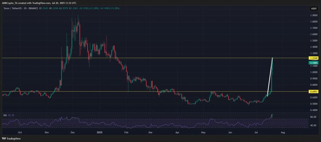 هیجان اصلی در ۱۹ ژوئیه رقم خورد، زمانی که قیمت XTZ در یک روز ۴۸.۴۸ درصد جهش داشت و این بزرگترین رشد روزانه از نوامبر بود. این رشد، بیش از نیمی از سود هفتگی XTZ را تشکیل داد و شاخص RSI را به محدوده اشباع خرید برد. اگر قدرت خرید ادامه یابد، XTZ میتواند به مقاومت ۱.۲۰ دلار نیز نزدیک شود. با این حال، در صورت تصحیح یا برداشت سود، احتمال بازگشت به زیر ۱ دلار وجود دارد.