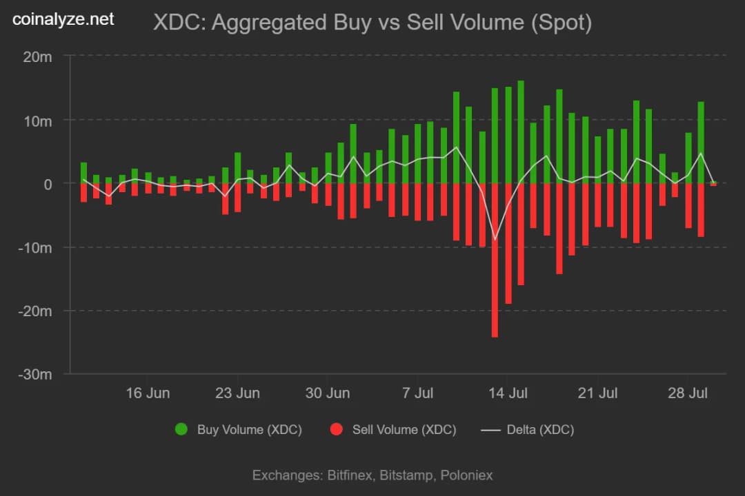 پس از کاهش قیمت XDC به کف محلی ۰.۰۷۹ دلار، خریداران با قدرت بازگشتند. طبق دادههای Coinalyze، شبکه XDC در سه روز پیاپی، شاهد دلتای مثبت بین خرید و فروش بوده؛ شرایطی که به بازیابی قیمت کمک کرده است.
