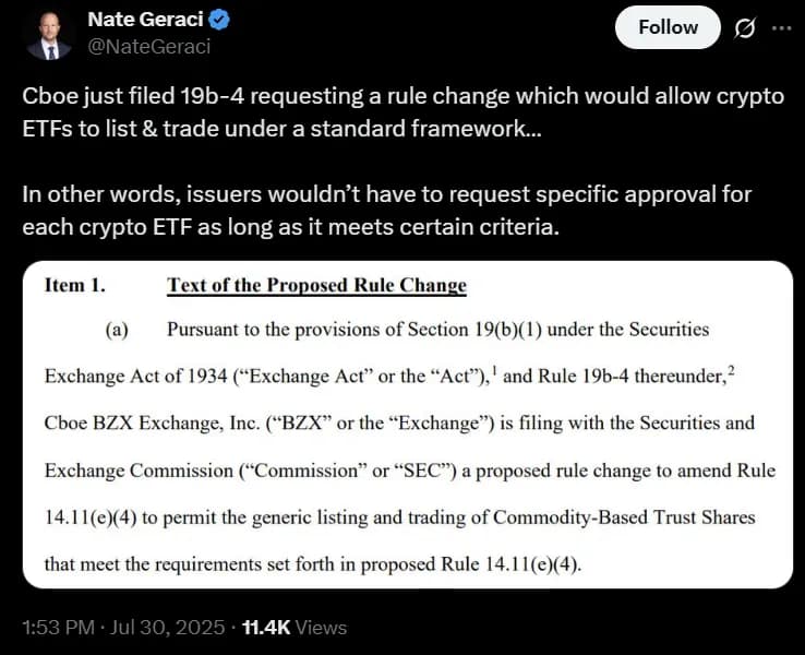 نیت گراسی، تحلیلگر ETF، تاکید کرد که این تغییر پیشنهادی میتواند مسیر تأیید صندوقهای قابل معامله رمزارزی (ETF) را سادهتر کند. به گفته وی، اگر این قانون تصویب شود، «ناشران نیازی به دریافت تاییدیه جداگانه برای هر ETF رمزارزی نخواهند داشت به شرطی که معیارهای مشخصی را رعایت کنند». گراسی همچنین اشاره کرد که بورس NYSE Arca نیز درخواست مشابهی ارائه کرده است.
