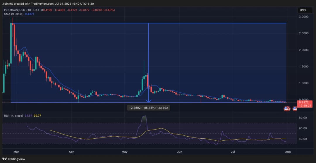 راهاندازی شبکه اصلی باز به رویای ثروتمندشدن ناگهانی منجر نشد. پس از یک جهش ابتدایی، قیمت بهشدت سقوط کرد. برخی گزارشها از افت ۸۴ درصدی خبر میدهند، چرا که کاربران اولیه برای فروش عجله کردند. تا تابستان ۲۰۲۵، کوین حتی برای باقیماندن بالای پنجاه سنت روی معدود پلتفرمهایی که آن را لیست کردهاند (یا IOUهای آن را عرضه میکنند) با مشکل مواجه بود. در زمان نگارش این مقاله، ارز Pi با قیمت ۰.۴۱ دلار معامله میشد، پس از آنکه از سقف ۲.۸۰ دلار سقوط کرده بود.