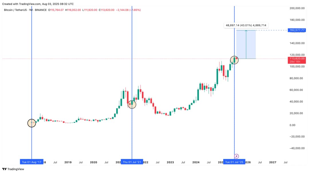 بررسی نمودارها نشان میدهد بیت کوین آماده فتح سقف تاریخی جدید است. در سالهای پس از هاوینگ، بازدهی آگوست به طور میانگین ۴۳ درصد بوده (به ترتیب ۳۰، ۷۷ و ۲۲ درصد). چنین رشدی میتواند قیمت بیت کوین را تا ۱۶۲ هزار دلار برساند.