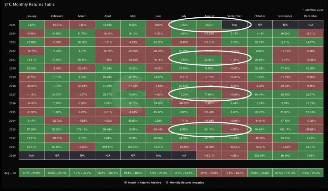 به طور سنتی، سهماهه سوم سال در سالهای هاوینگ، اغلب دورهای صعودی برای بیت کوین بوده است؛ چرا که در این سالها پاداش برای تامین امنیت شبکه بیت کوین کاهش مییابد. این الگو در سالهای ۲۰۱۳، ۲۰۱۷ و ۲۰۲۱ نیز رخ داده است؛ در هر یک از این سالها با رشد در ماه جولای شروع شده و معمولاً در آگوست نیز ادامه یافته است. امسال نیز به نظر میرسد این روند تکرار شود و بیت کوین تاکنون ۷.۲۲ درصد در جولای افزایش یافته است. اگر تاریخ تکرار شود، احتمالاً روند صعودی در آگوست نیز ادامه یابد.