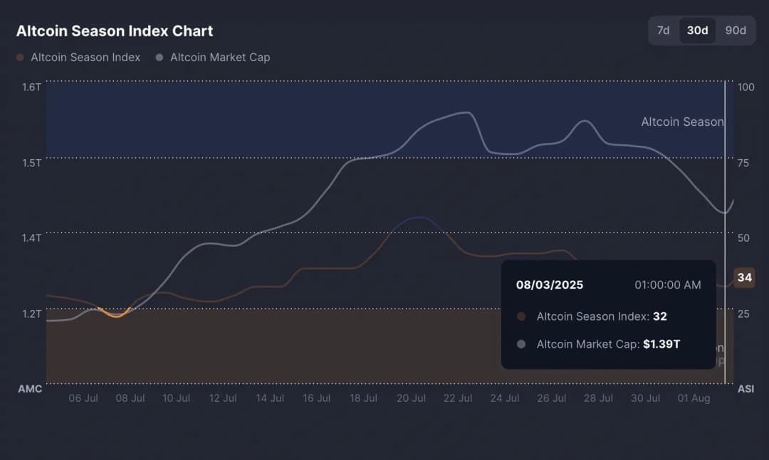 بررسی شاخص فصل آلتکوینها توسط AMBCrypto نشان میدهد این شاخص از ۳۲ به ۳۴ در هفته اخیر افزایش یافته است که بر اساس دادههای CoinMarketCap، بیانگر ورود سرمایه بیشتر به بازار آلتکوینهاست. اگر این روند ادامه پیدا کند، چرخش سرمایه به سمت آلتکوینها تایید شده و زمینه برای رشد بیشتر آنها فراهم میشود.