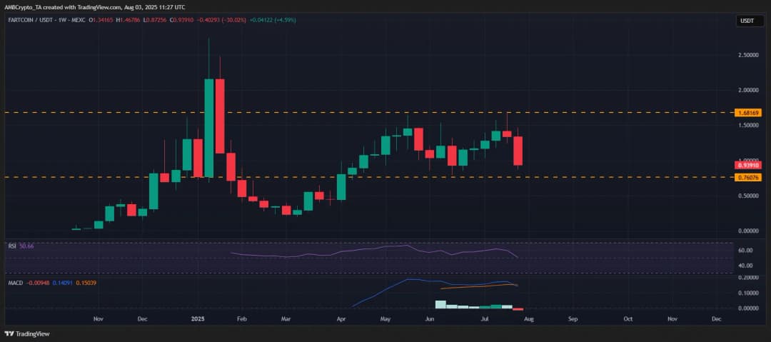 از طرف دیگر، Fartcoin [FARTCOIN] بدترین پایان هفته را از ماه مارس تجربه کرد و با سقوط ۲۹ درصدی از ۱.۳۰ دلار به حدود ۰.۹۳ دلار رسید تا بزرگترین بازنده این هفته باشد. این افت تمام پیشرفت ماههای گذشته را از بین برد و سطح مقاومت ۱.۶۰ دلار از ماه می به دیوار محکمی تبدیل شد. همچنین برای اولین بار اندیکاتور MACD هفتگی این ارز وارد فاز نزولی شد که احتمال ادامه نزول را افزایش میدهد.