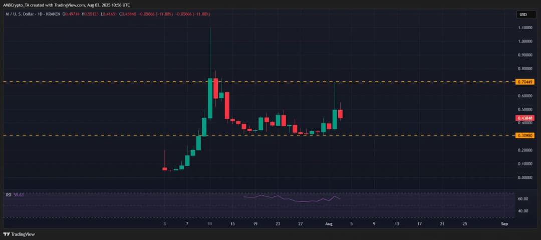 اما روند صعودی نزدیک ۰.۷۰ دلار با فشار فروش مواجه شد، به طوری که این محدوده به عنوان مانعی جدی عمل کرد و بخشی از سودها را کاهش داد. با این حال، M تقریباً همه ضررهای اخیر خود را جبران کرد و ساختار صعودی خود را بازیافت که در صورت تثبیت بالای ۰.۴۵ دلار، رمزارزی قابل توجه برای هفتههای آینده خواهد بود.