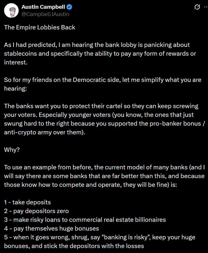 در ماه مه، پروفسور دانشگاه NYU و مشاور بلاکچین، آستین کمبل، بر اساس منابعی از داخل صنعت بانکداری، فاش کرد که مؤسسات مالی به طور فعال برای جلوگیری از عرضه استیبلکوینهای سوددار لابی میکنند تا مدل کسبوکار قدیمی خود را حفظ نمایند.