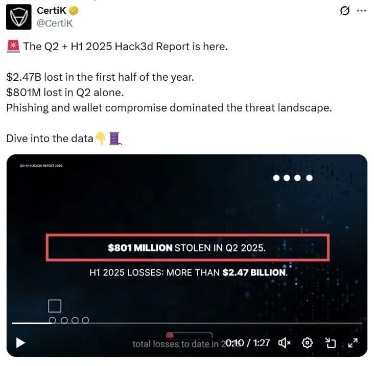به گفته شرکت CertiK، هکها و سوءاستفادههای رمزارزی در نیمه اول ۲۰۲۵ به ۲.۴۷ میلیارد دلار رسیده که بیش از ۸۰۰ میلیون دلار تنها در سه ماهه دوم و در ۱۴۴ حادثه ثبت شده است؛ هرچند این رقم نسبت به سه ماهه اول سال ۵۲ درصد کاهش یافته است.