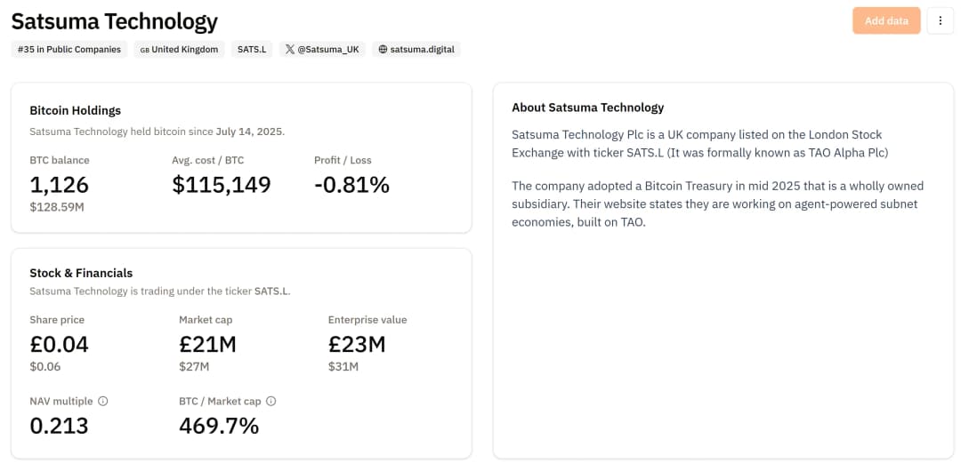 ساتسوما تاکنون ۱۱۲۶ بیت کوین به ارزش تقریبی ۱۲۸.۶۶ میلیون دلار در اختیار دارد که از ۱۴ ژوئیه تاکنون خریداری کرده است. طبق دادههای BitcoinTreasuries.NET، متوسط قیمت هر بیت کوین برای این شرکت ۱۱۵,۱۴۹ دلار بوده، و در حال حاضر ۰.۷۶ درصد زیان تحققنیافته دارد.