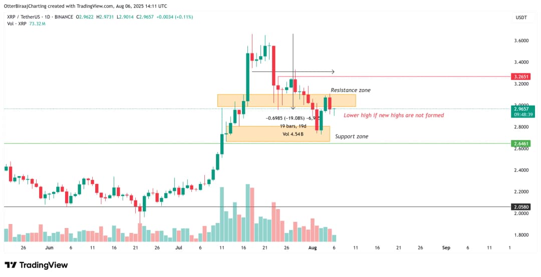 مطابق تحلیل معاملهگر برجسته حوزه رمزارز Nebraskangooner، XRP ممکن است با "ریزش کامل پس از پامپ" روبهرو شود؛ یعنی قیمت احتمالاً به کف رشد قبلی خود در محدوده ۲ دلار بازگردد. به گفته وی، سطح ۲.۶۵ دلار برای ساختار صعودی بازار XRP بسیار کلیدی است زیرا در نیمه اول ۲۰۲۵ بارها به عنوان مقاومت مهم عمل کرده بود و بعد از اینکه در جولای شکسته شد، به یک حمایت قوی تبدیل شد. حفظ این سطح برای ادامه روند صعودی الزامی خواهد بود.