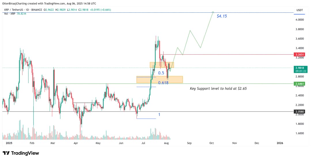 تحلیلگر تکنیکال Mind Trader نیز میگوید XRP پس از فتح قله ۳.۶۵ دلار، ۵۰ درصد اصلاح قیمتی داشته است. اگر این سطح یعنی اصلاح ۵۰ درصدی حفظ شود، احتمال رشد دوباره تا ۴.۱۵ دلار و حتی ثبت اوج قیمتی جدید وجود دارد. اما در صورت شکستهشدن سطح ۲.۶۵ دلار، ممکن است قیمت XRP به محدوده قبلی بازگشته و سطح ۲ دلار دوباره تست شود، که این امر ماهها رشد قیمت را خنثی و نشانه ضعف کلی خواهد بود.