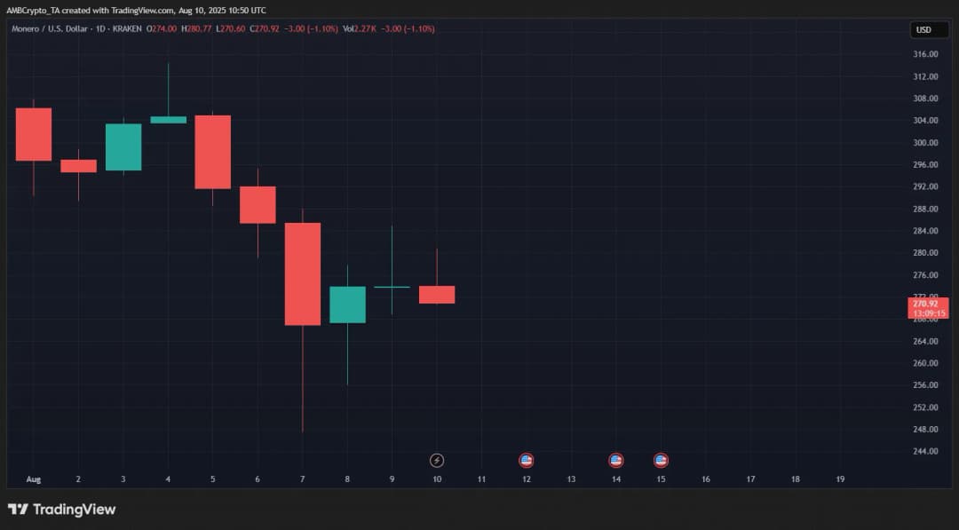 از ابتدای ماه اوت، Monero (XMR) در یک روند نزولی مداوم قرار داشته و از بالای 300 دلار به 270.92 دلار کاهش یافته است. این افت بین 5 تا 7 اوت شتاب گرفت و کندلهای قرمز پیاپی سطوح حمایت کلیدی را شکستند. در 8 اوت فشار فروش کمی کاهش یافت اما خریداران نتوانستند ادامه روند صعودی ایجاد کنند و حرکت قیمت ضعیف مانده است. اگر مومنتوم نزولی ادامه یابد، احتمال بازآزمایی محدوده 264-260 دلار وجود دارد.