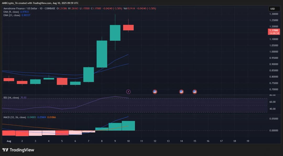 Aerodrome Finance (AERO) این هفته رالی شکست را ادامه داد و از زیر 0.80 دلار تا بالای 1.25 دلار رشد کرد و سپس تا 1.17 دلار اصلاح شد. افزایش سریع قیمت شاخص RSI را به منطقه اشباع خرید در 70.9 رساند. در همین حال، مومنتوم صعودی در MACD هم قوی مانده بود.