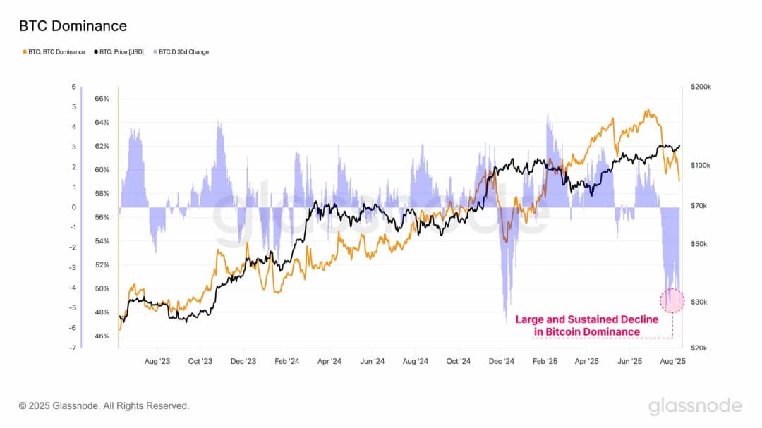مجموع ارزش بازار آلتکوینها به اوج سهماهه ۱.۶۷ تریلیون دلار رسید، هرچند هنوز از ۲.۳۹ تریلیون دلار بیت کوین عقبتر است. با این وجود، چرخش سرمایه بهروشنی در جریان است. بهگفته Glassnode، سلطه بیت کوین تنها در دو ماه از ۶۵٪ به ۵۹٪ کاهش یافته است.