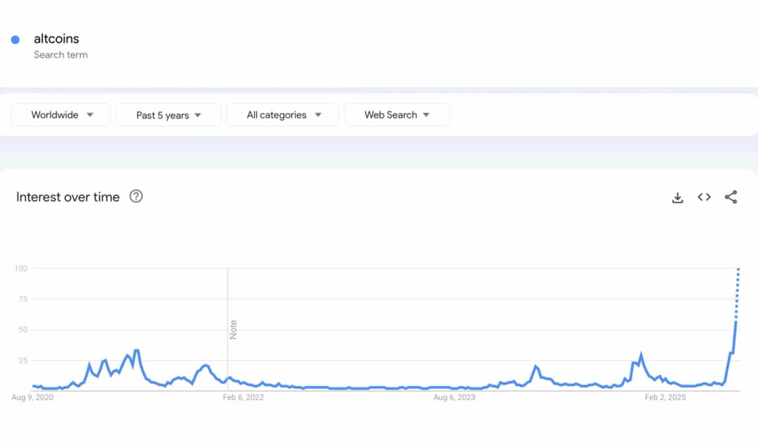 به نظر میرسد علاقه سرمایهگذاران خرد به سمت آلتکوینها در حال چرخش است. در واقع، دادههای Google Trends نشان میدهد جستوجوهای جهانی برای «altcoins» به اوج ۵ ساله رسیده و از مرز ۵۰٪ عبور کرده است.
