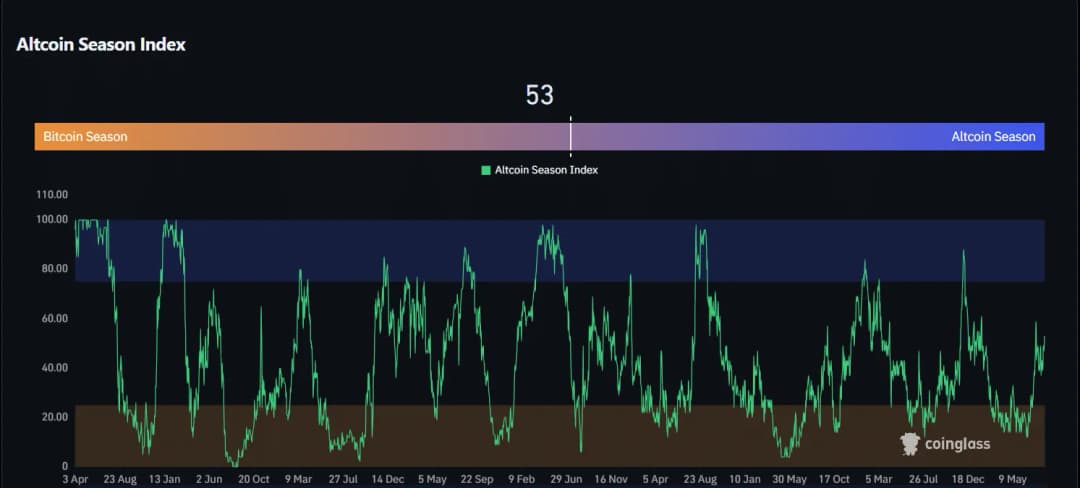 شکست جدید نشاندهنده احتمال حرکت تا ۲۰۰ برابر است و نشاندهنده خوشبینی و احساسات صعودی در میان آلتکوینهاست. در همین حال، شاخص فصل آلتکوین CoinGlass در زمان انتشار خبر روی عدد ۵۳ بود. این مقدار بالاتر از نقطه خنثی ۵۰ است، اما هنوز در محدوده کامل «فصل آلتها» (معمولاً بالای ۷۵) قرار ندارد. آلتکوینها در حال شروع به عملکرد بهتر نسبت به بیت کوین هستند اما روند نیاز به تأیید دارد.