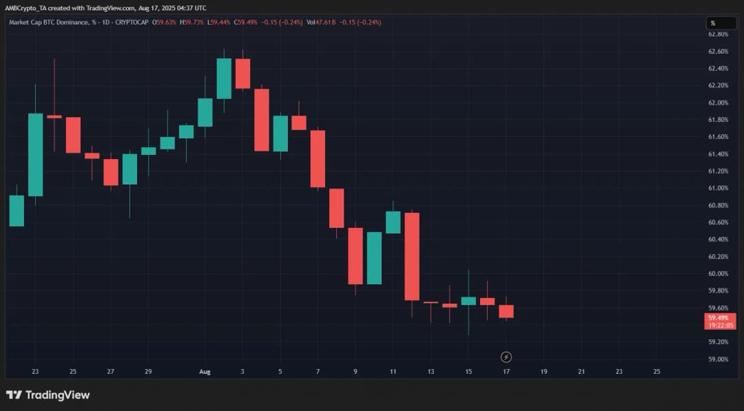 تقویتکننده این موضوع نمودار سلطه بیت کوین است که همچنان در حال سقوط است و اکنون در حدود ۵۹٫۴۹٪ قرار دارد.