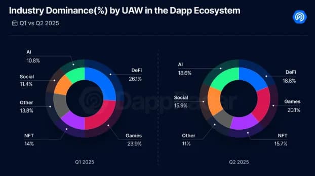 گزارش سهماهه دوم 2025 DappRadar نشان میدهد فعالیت روزانه کیفپولها در حدود 24 میلیون ثابت است. با این وجود، تغییر در اولویت بخشها در حال ظهور است. بازیهای کریپتو همچنان بزرگترین دسته هستند و بیش از 20٪ سهم بازار را دارند، اگرچه نسبت به سهماهه اول کاهش داشتهاند. دیفای نیز افت کرده و از بیش از 26٪ به زیر 19٪ رسیده است. در مقابل، اپلیکیشنهای اجتماعی و مرتبط با هوش مصنوعی در حال جذب توجه بیشتری هستند.