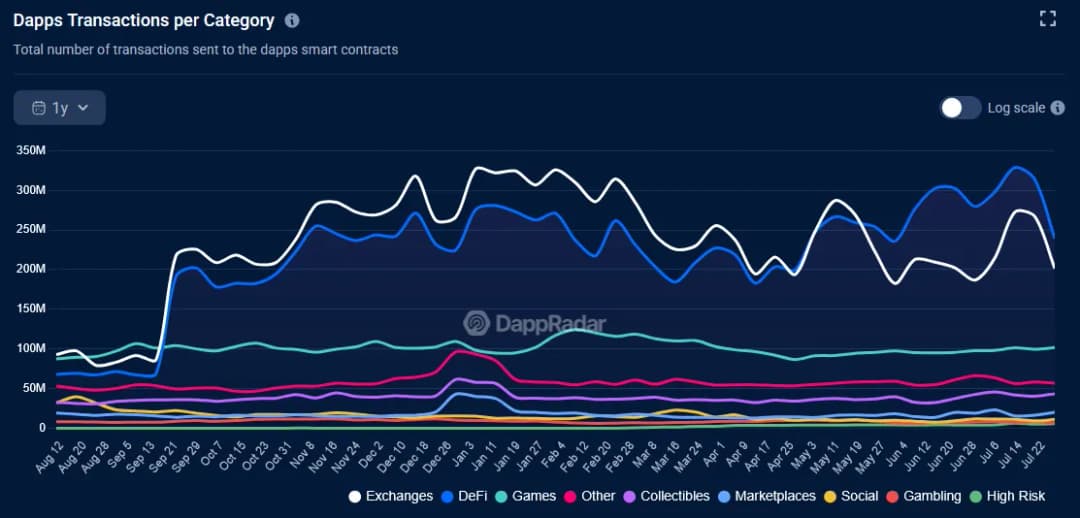 تعداد تراکنشها نشان میدهد چند بار قراردادهای هوشمند فعال میشوند، اما این عدد میتواند با رباتها یا اتوماسیون باد کند. ردپای تراکنشی دیفای تناقضآمیز است: پایه کاربران آن کاهش یافته، با این حال هنوز بیش از 240 میلیون تراکنش هفتگی تولید میکند که بیشتر از هر دسته Web3 دیگر است. فعالیت مرتبط با صرافیها (که ممکن است با دیفای همپوشانی داشته باشد) به این تسلط اضافه میکند، بازیهای کریپتو با 100 میلیون تراکنش هفتگی در رتبه بعدی قرار دارند و دسته «سایر» (به جز اجتماعی اما شامل هوش مصنوعی) 57 میلیون تراکنش هفتگی دارد.