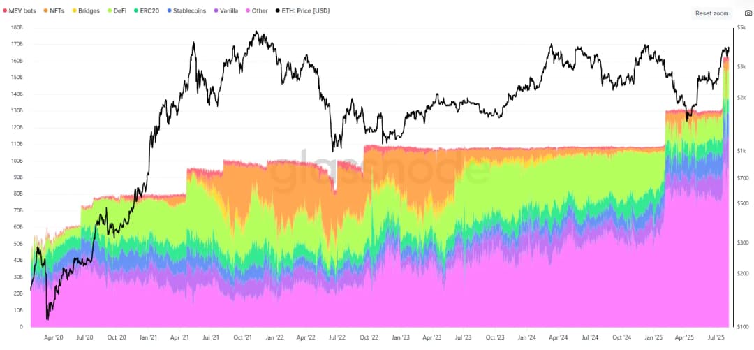 دادههای تراکنش به تنهایی تصویر کامل Web3 را نشان نمیدهد. مصرف گس اتریوم میتواند نشان دهد وزن اقتصادی و محاسباتی واقعاً کجا قرار دارد. دادههای Glassnode نشان میدهد که دیفای با اینکه بخش کلیدی اتریوم است، اکنون تنها 11٪ از مصرف گس را تشکیل میدهد. NFTها که در 2022 سهم قابل توجهی از گس داشتند، اکنون به 4٪ کاهش یافتهاند. اما دسته «سایر» از حدود 25٪ در 2022 به بیش از 58٪ امروز جهش کرده است. این دسته شامل زمینههای نوظهوری مانند توکنیزهسازی داراییهای دنیای واقعی (RWA)، زیرساخت فیزیکی غیرمتمرکز (DePIN)، اپلیکیشنهای مبتنی بر هوش مصنوعی و خدمات دیگر است که ممکن است فاز بعدی رشد Web3 را تعریف کنند.
