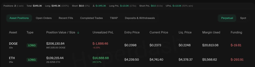 وین همچنین یک پوزیشن لانگ ۱۰ برابری روی دوج کوین (DOGE) دارد؛ این موقعیت شامل ۸۶۷,۳۳۵ دوج کوین به ارزش ۲۰۶,۱۳۰ دلار است. با میانگین قیمت ورود ۰.۲۳۹۸ دلار، این معامله کمی در ضرر است و زیان تحققنیافتهای حدود ۱,۸۸۶ دلار نشان میدهد؛ دوج کوین در حال حاضر نزدیک ۰.۲۳۷ دلار معامله میشود.