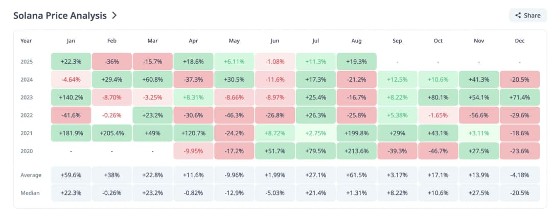 سپتامبر اغلب برای سولانا خوشیمن بوده است. در چهار سال از پنج سال گذشته، SOL ماه سپتامبر را در محدودهٔ سبز بسته است و بازدههایی مانند 29٪ در 2021، 8.2٪ در 2023 و 12.5٪ در 2024 ثبت شدهاند. میانگینها هم این موضوع را تأیید میکنند: میانگین رشد ماهانهٔ سپتامبر حدود 17٪ و میانه بازده 10.6٪ بوده است.