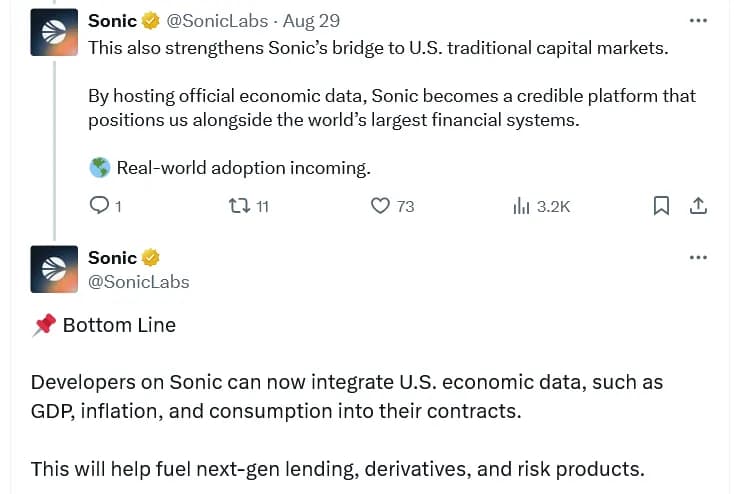 این اقدام به توسعهدهندگان اجازه میدهد که آمار کلان اقتصادی آمریکا را مستقیماً روی سونیک مرجعدهی کنند بدون اینکه مجبور باشند به وبسایت وزارت بازرگانی مراجعه کنند. سونیک گفته که این حرکت نوآوری جدیدی را روی پلتفرم باز خواهد کرد — مانند توسعه مدلهای معاملاتی مبتنی بر تولید ناخالص داخلی و دادههای تورم و اعمال سیگنالهای کلان برای وامدهندگان روی زنجیره.