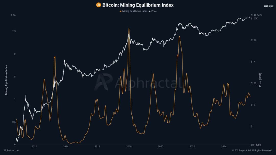 در میان این هزینههای رو به رشد، شاخص توازن استخراج (Mining Equilibrium Index یا MEI) در محدودهای بین خنثی تا گاوی باقی ماند. در زمان نگارش، این شاخص نزدیک به 1.06 بود که بسیار پایینتر از میانگین تاریخیِ حدود 2.5 اما بالای خط استرس 0.5 قرار میگیرد. معمولاً وقتی MEI بالای 0.5 است، به این معناست که شرکتهای استخراج میتوانند بدون تسلیم و فروش گسترده BTC، عملیات خود را تامین مالی کنند. همچنین عبور از سطح 1.0 سیگنال حاشیه سود قابل توجه را نشان میدهد.