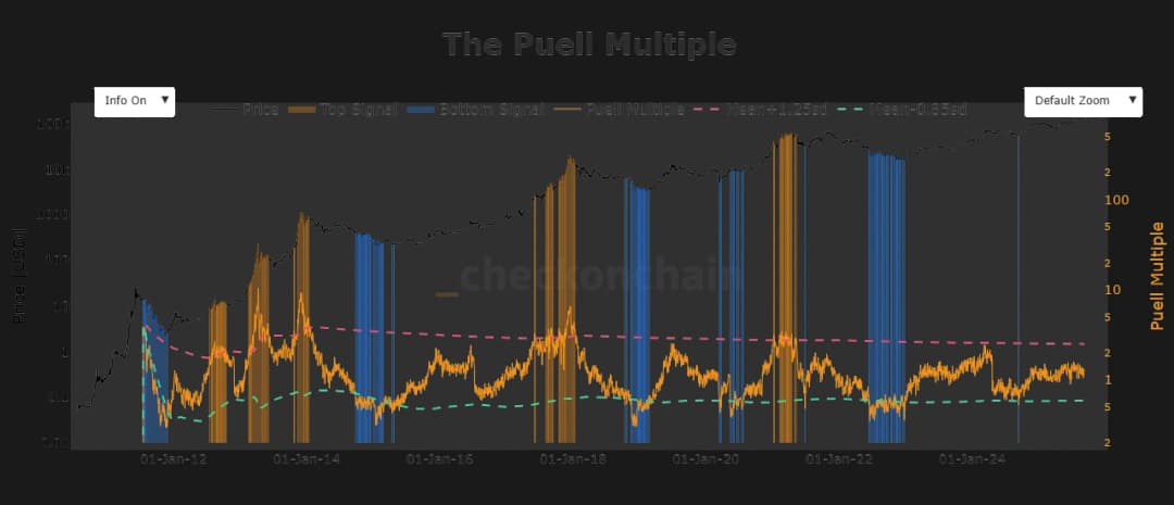 نکته جالب این است که ماینرها صرفاً به این دلیل که انگیزه ندارند نمیفروشند؛ بلکه وضعیت درآمدی آنها نیز تاثیرگذار است. اکنون به Puell Multiple میپردازیم. این معیار در حدود 1.1 قرار داشت که نشان میداد درآمد ماینرها تقریباً ۱۰٪ بالاتر از میانگین ۳۶۵ روزه است.