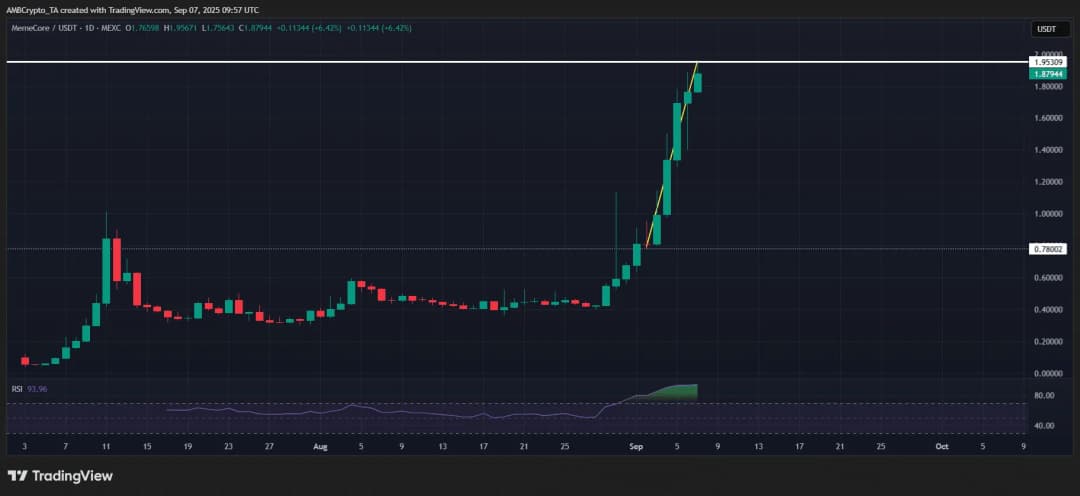 MemeCore [M] در صدر جدول صعودها قرار گرفت و بیش از ۱۷۰٪ رشد نسبت به بازشدن در ۰.۶۷ دلار ثبت کرد که بزرگترین عملکرد هفتگی از زمان جهش ۵۷۰٪ در اوایل جولای است. نمودار همچنین حمایت خرید منطقی در سطوح پایینتر را نشان میدهد. M سپتامبر را با شکست بریک اوت از رشد ۵۲٪ هفته گذشته که از ۰.۴۷ دلار آغاز شده بود، شروع کرد؛ RSI داغ بود اما قیمت همانطور در یک روز ۱۹.۵٪ جهش کرد که نشان میدهد خریداران حتی در نزدیکی سقف محلی نیز موقعیت میگرفتند.