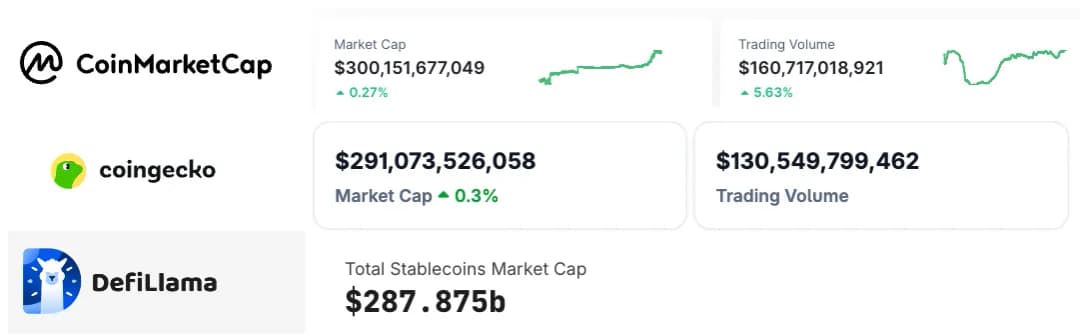 سرمایه کل بازار استیبل سکهها روز پنجشنبه در CoinMarketCap (CMC) به ۳۰۰ میلیارد دلار آمریکا رسید، اما CoinGecko رقم ۲۹۱ میلیارد دلار آمریکا و DefiLlama نیز روز جمعه رقم ۲۸۹ میلیارد دلار آمریکا را اعلام کرد که این اختلافها بارز است.