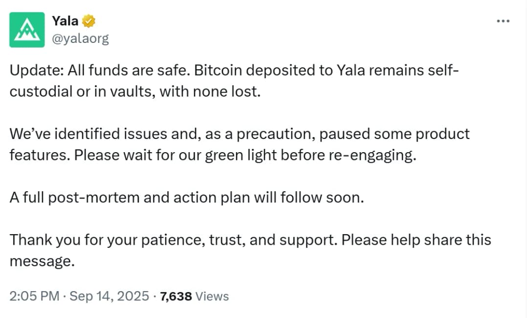 تیم یالا اعلام کرد که با شرکت امنیت بلاک چین SlowMist و سایر شرکای امنیتی در حال بررسی نفوذ است. در بهروزرسانی اخیر آنها در X آمده است: «تمام وجوه امن هستند. بیت کوین واریز شده به یالا یا در اختیار خود کاربران است یا در گاوصندوق ها قرار دارد و هیچگونه کاهشی رخ نداده است.»