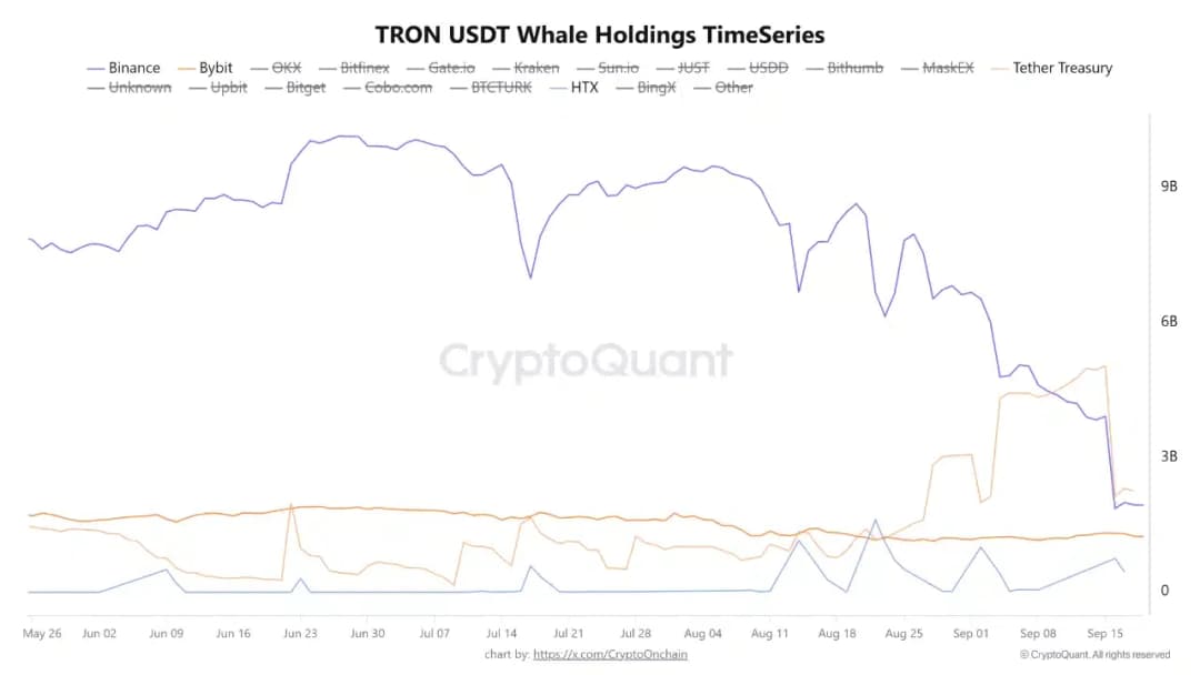 کیف پولهای Tether از اوایل سپتامبر به طور پیوسته افزایش یافته و به حدود 4 میلیارد دلار رسیدهاند. در همین حال Bybit در حدود 1.3 میلیارد دلار وضعیت خود را حفظ کرده است. استراتژیها در مدیریت نقدینگی در حال تحول هستند و این شیوهها نحوه استفاده بازیگران سازمانی از شبکه TRON برای جریانهای USDT را تغییر میدهد.