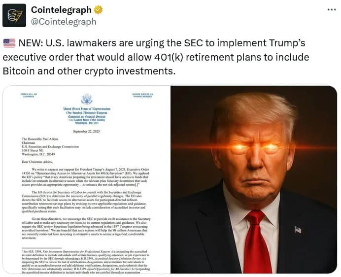 قانونگذاران اشاره کردند که طبق دستور اجرایی دونالد ترامپ در ماه اوت با عنوان «دموکراتیزه کردن دسترسی به دارایی های جایگزین برای سرمایه گذاران 401(k)»، از SEC خواسته شده است تا دسترسی به دارایی های جایگزینی مانند رمز ارز را در برنامه های بازنشستگی با مدیریت شرکت کنندگان آسان تر کند، همزمان با در نظر گرفتن قوانین مربوط به سرمایه گذاران معتبر و خریداران واجد شرایط.