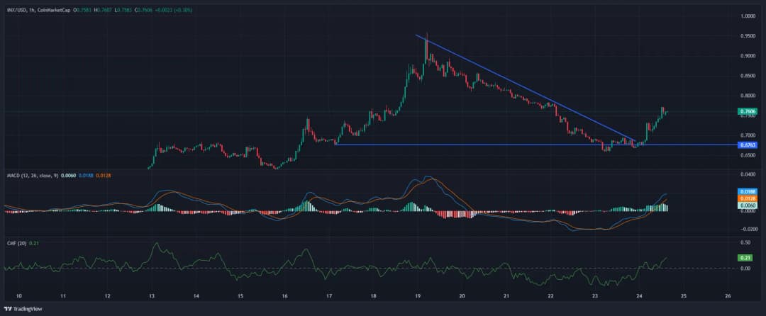 رفتار قیمت در چارت ساعتی نشاندهنده یک تغییر بالقوه در ساختار بازار بود. IMX یک خط روند نزولی را بریک اوت کرد و قیمت از 0.65 دلار تا 0.76 دلار بالا آمد تا زمان نگارش خبر. مومنتوم با خوانش سبز شاخص MACD تأیید شد. شواهد ورود سرمایه را همچنین افزایش شاخص جریان پول چایکین (Chaikin Money Flow) که روی 0.20 قرار داشت، تأیید میکرد.