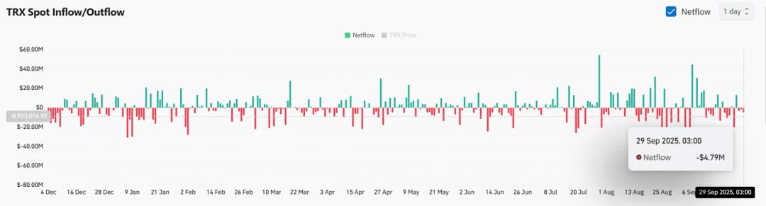 جریان خالص ورودی ها و خروجی ها در بازار اسپات TRX در سپتامبر به صورت مداوم خروجی نشان داد، از جمله 4.79 میلیون دلار خروجی در تاریخ 29 سپتامبر. این موضوع فشار فروش قابل عرضه در صرافی ها را کاهش داده و به تجمع قوی تر بین هولدرها منجر شد. خروجی های پایدار معمولاً عرضه قابل دسترس را کاهش می دهند که در صورت وجود تقاضای سالم می تواند از استحکام قیمت پشتیبانی کند.