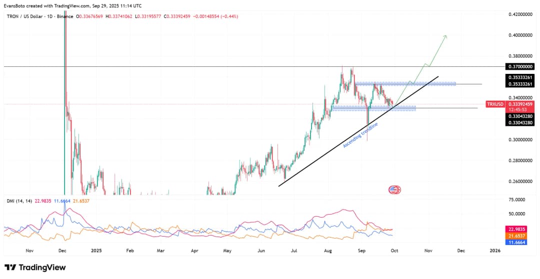 در زمان انتشار، TRX حوالی 0.33 دلار معامله می شد و بالای خط روند صعودی خود قرار داشت. این ساختار در زمان اصلاح قیمتی به عنوان یک معطوف قابل اعتماد عمل کرده و تنظیمات صعودی را برقرار نگه داشته است. در مقابل، شاخص DMI یک سیگنال نزولی را نشان داد که احتمال دارد قبل از بازگشت قیمت، یک تست مجدد از حمایت رخ دهد.