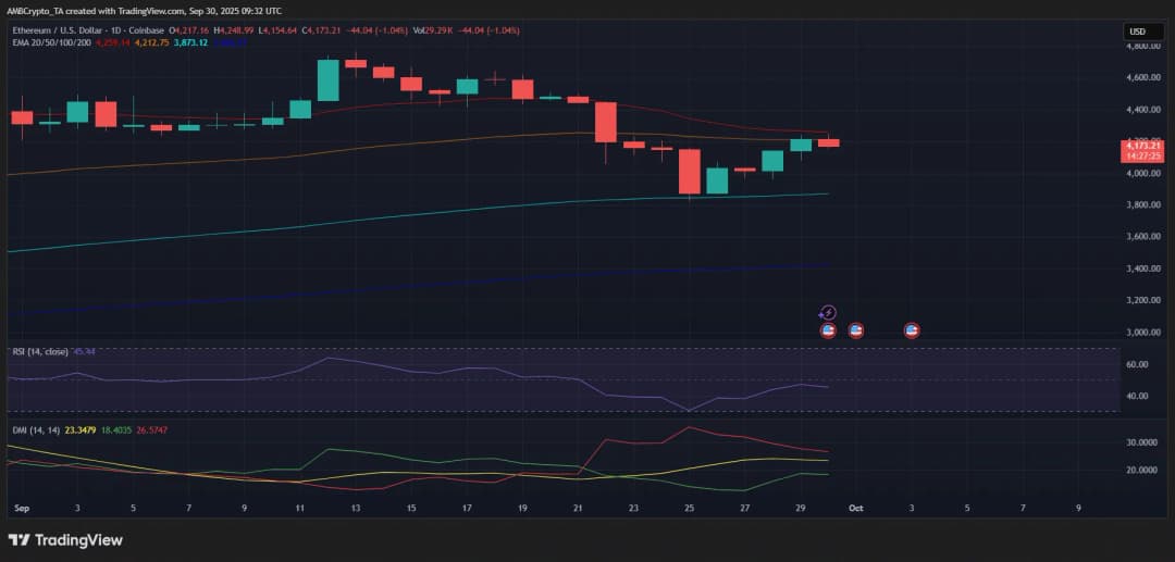 در زمان انتشار، اتریوم با قیمت ۴٬۱۷۳ دلار معامله میشد پس از یک حرکت برگشتی اندک از افت هفته گذشته. شاخص RSI در عدد ۴۵ باقی ماند و نشان میداد که ETH در محدوده خنثی قرار دارد. در همین حال، DMI نشان داد که شتاب نزولی در حال کاهش است و خط –DI شروع به صاف شدن در برابر +DI کرده است.