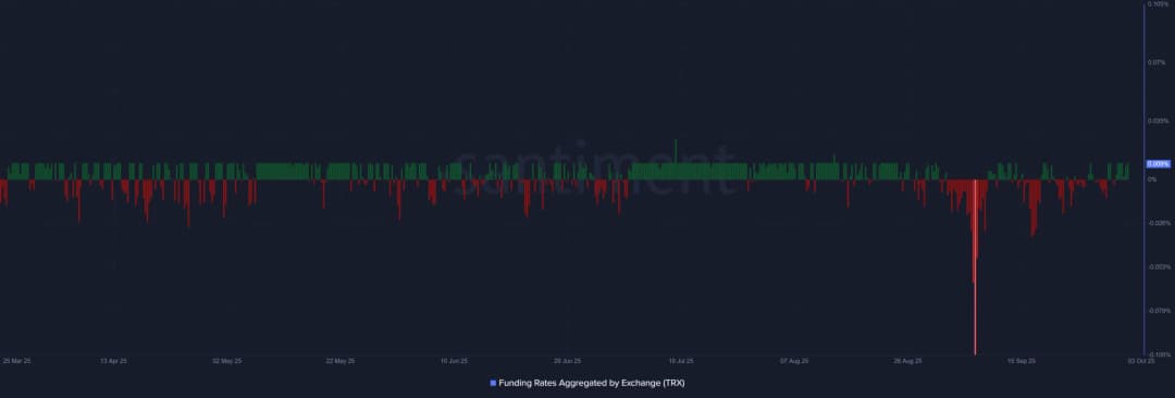 نرخ های فاندینگ در قراردادهای پرپچوال TRX همچنان کمی مثبت و در سطح 0.009 درصد، تا زمان نگارش گزارش، باقی مانده اند که نشان می دهد اکثریت معامله گران برای حفظ اکسپوژر لانگ هزینه پرداخت می کنند. این جهت گیری سبز مداوم اعتماد قوی میان شرکت کنندگان لوریج دار را برجسته می کند و همراه با سیگنال های تکنیکی و .درون شبکه، از قیمت های اسپات بالاتر حمایت می کند. با این حال، موقعیت های لانگ بالا معمولاً ریسک اصلاح قیمتی شدید را در صورت گرم شدن بیش از حد فاندینگ به همراه دارند. با این وجود سطوح فعلی ملایم مثبت فضا برای رشد بدون ریسک فوری لیکوئید شدن فراهم می کنند. این تعادل لحن کلی بازار را محتاطانه خوشبین نگه می دارد.