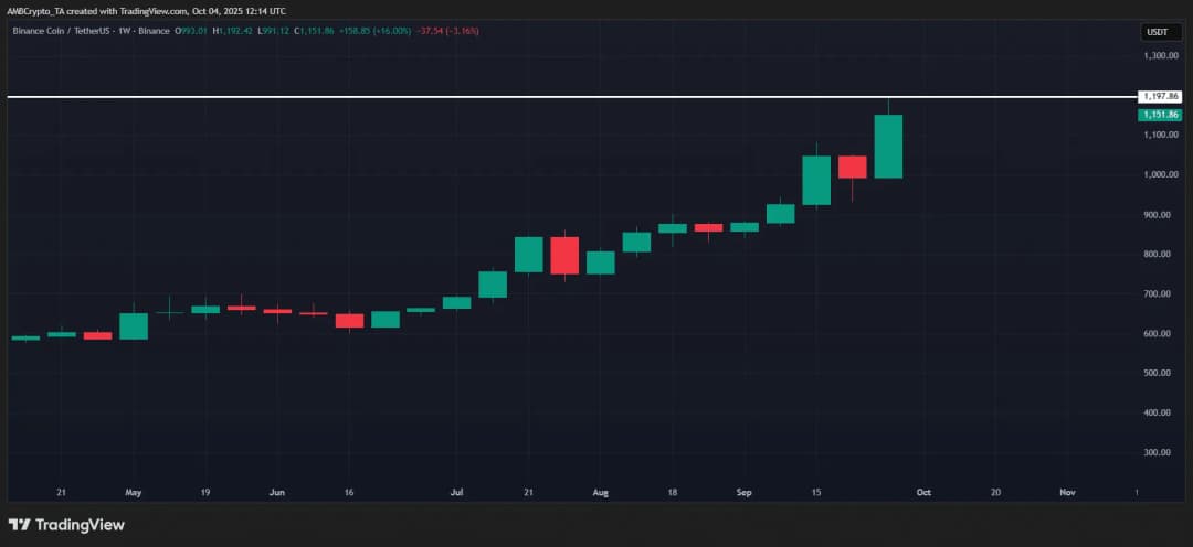 از دید تکنیکی، این به معنای ورود حدود ۲۶ میلیارد دلار سرمایه به BNB است و ارزش بازار آن را به حدود ۱۶۶ میلیارد دلار رسانده؛ یعنی تقریباً ۴٪ از بازار کریپتو به ارزش ۴.۲ تریلیون دلار. قیمت ضمنی هر واحد BNB اکنون ۱,۱۹۴ دلار است که رکورد جدیدی به حساب میآید.