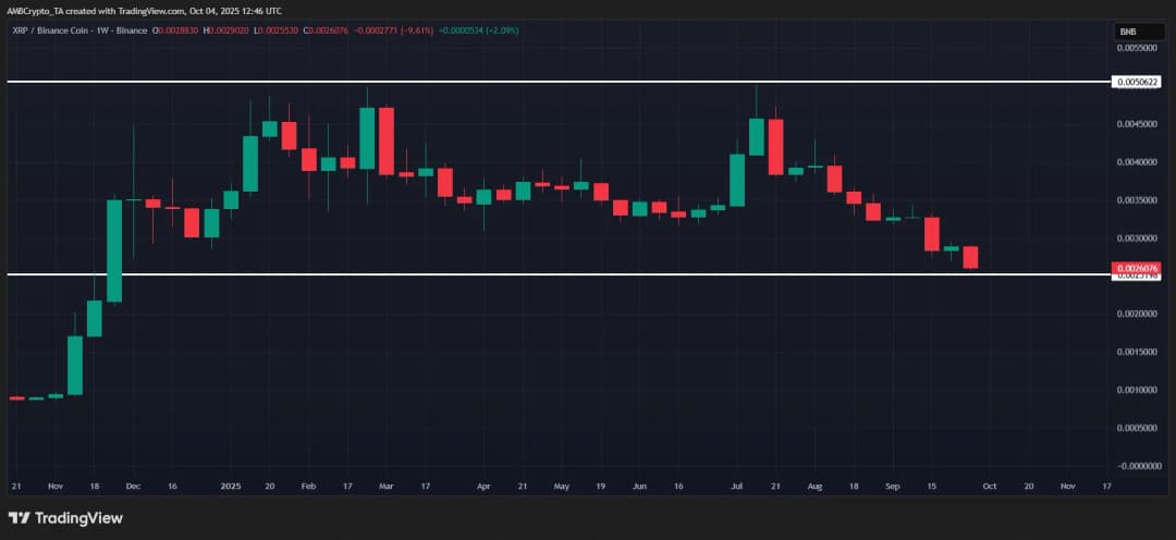 آمار نشان میدهد نسبت XRP/BNB از جولای تقریباً ۶۰٪ سقوط کرده و به کف نزدیک به یک سال رسیده است. در نمودار هفتگی شاهد سه تلاش شکستخورده برای بریک اوت بودهایم که نسبت را زیر سطوح حمایت کلیدی فشار دادهاند. به بیان ساده، دیوار خرید ضعیفتر میشود چون سرمایهها از ریپل خارج و وارد بایننس کوین میشوند.