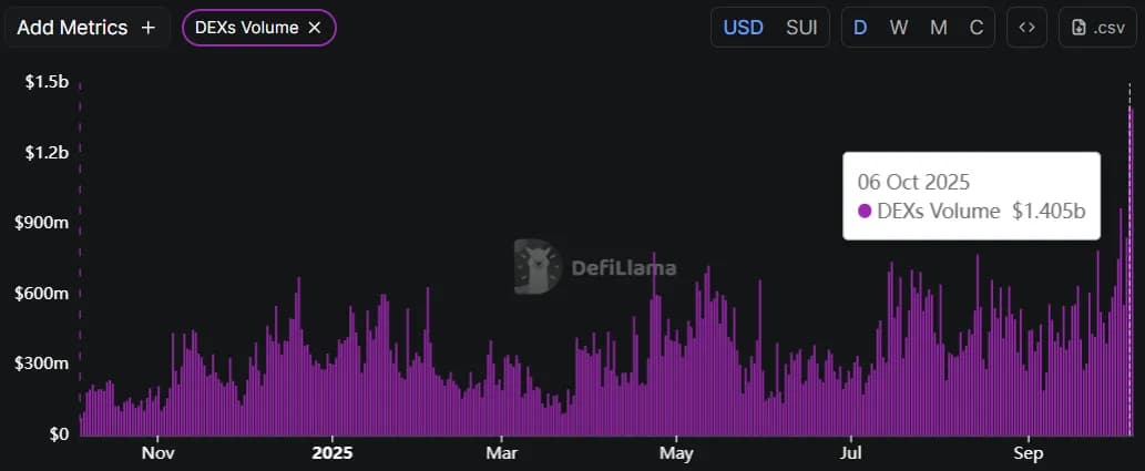 با این دید، شاخصهای درون شبکه نیز با پیشبینی علی همسو بودند. طبق دادههای DeFiLlama، SUI به رکورد جدیدی در حجم روزانه DEX نزدیک به $1.43 میلیارد رسید. علاوه بر این، حجم معاملات پرپچوال ۲۴ ساعته حدود $160 میلیون بود.