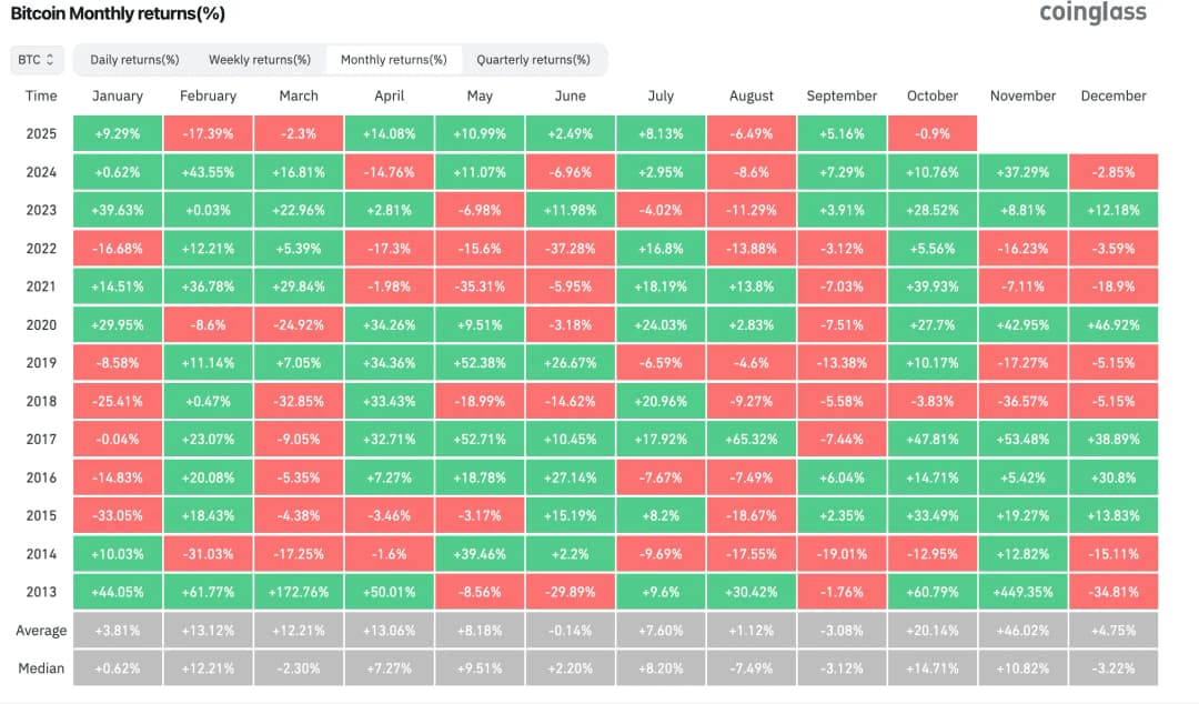 از سال 2013، اکتبر به طور متوسط دومین ماه بهتر عملکرد بیت کوین بوده است و بازده میانگین 20.10% داشته که تنها نوامبر با میانگین 46.02% عملکرد بهتری نشان داده، طبق داده های CoinGlass.
