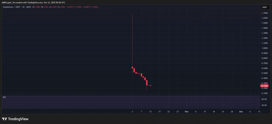DoubleZero (2Z) با افت 50% صدر فهرست بازندگان هفته را گرفت و ساختار بازار نزولی خود را تقویت کرد. فعالیت درون شبکه کم رونق باقی ماند که نشان می داد علاقه به خرید در کف کم بوده است، همان طور که AMBCrypto اشاره کرد. نگاه به چارت روزانه یک کندل کوچک سبز در 6 اکتبر را نشان می داد که افزایش جزیی 0.83% را منعکس می کرد اما مومنتوم سریعاً محو شد و چهار کف هفتگی متوالی شکل گرفت. به عبارت دیگر، خریداران نتوانستند سطوح کلیدی را به حمایت تبدیل کنند و منطقه 0.50 دلار به عنوان مقاومت عمل کرد. تا زمانی که این روند معکوس نشود، انتظار یک بازگشت معنادار زودهنگام خام است، مخصوصاً در یک بازار نوسانی و ریسک گریز.